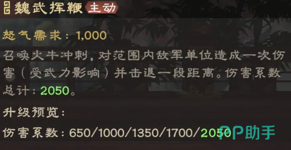 曹操的怒气技会召唤火牛展开冲刺,对沿途范围内的敌人造成伤害,并击退一段距离,此招伤害系数不算高,但可以牵制敌方的输出,他的被动“龙战于野”能在部队普通攻击后,有10%的概率缴械敌方的部队,持续4秒的时间。