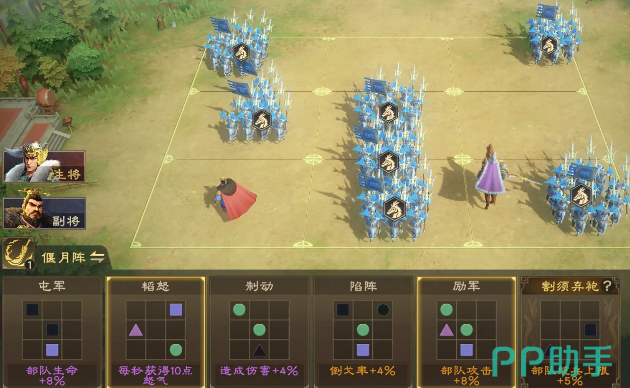 实战选择阵法如果用来针对技能队,建议去选择偃月阵,这样普攻能提供沉默,有较高的打击面覆盖,阵容推荐割须骑,也就是和马超组队,兵种选择虎豹骑来延长控制时间,该队伍能触发割须弃袍羁绊,提升统兵上限,从而提升队伍持续作战能力,这两人都带有降低敌人怒气效果,在加上沉默机制可以有限限制敌人的输出。