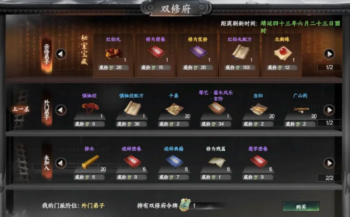 然而,双修府的门槛并不低,要想在这片江湖中脱颖而出,你得不断提升自己的实力。晋升的条件从一开始的240到后来的600,不仅仅考验你的“诡辞”属性,还需要你不断挑战自我、跨越一个又一个的难关。只要你不断强化诡辞属性,便能解锁更高的职位和技能。而这其中,提升诡辞属性的途径有很多,最直接的就是去贡献堂主苓儿那里兑换相关的提升书籍。为了提升自己的能力,你还可以通过完成悬赏任务或者消耗铜钱,获得一些有价值的令牌,进一步增强自己在门派中的地位。