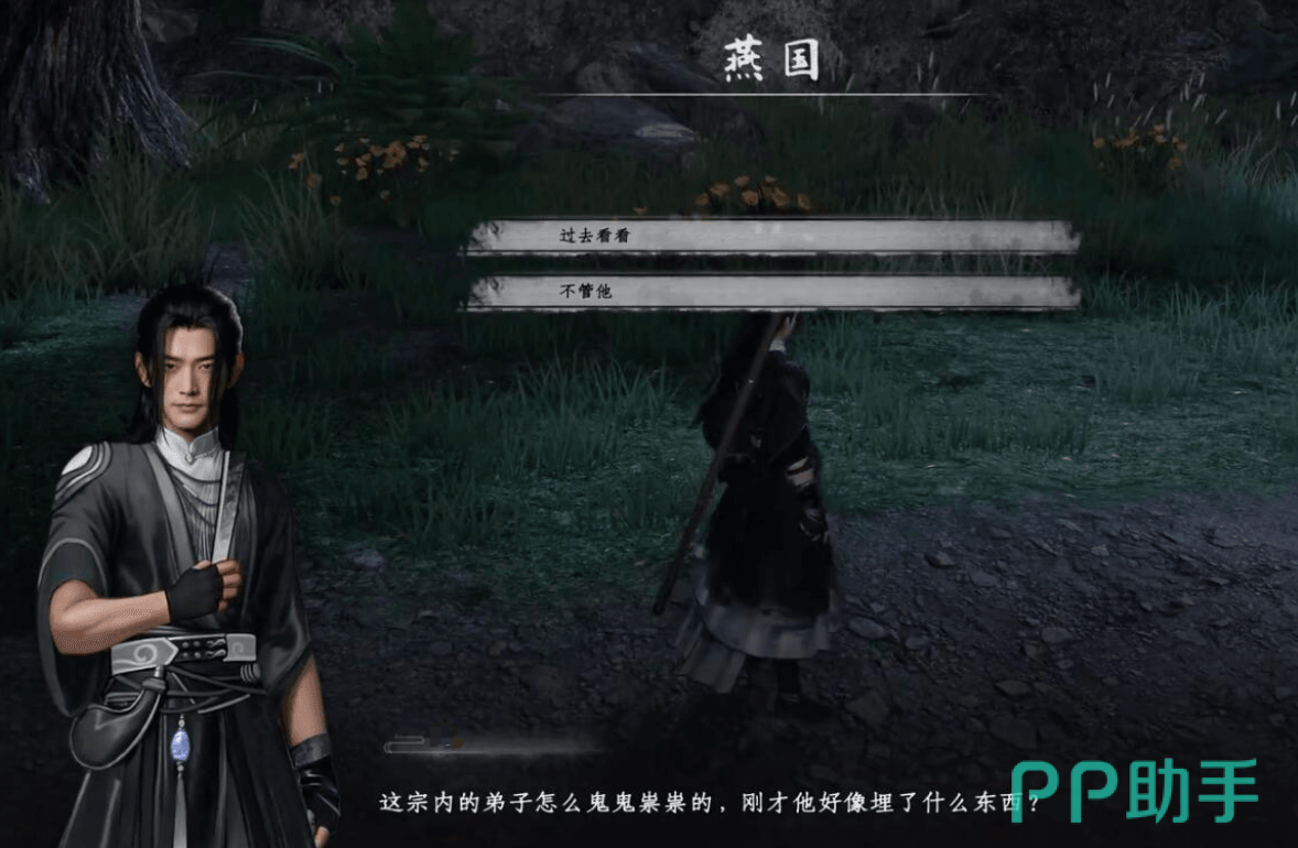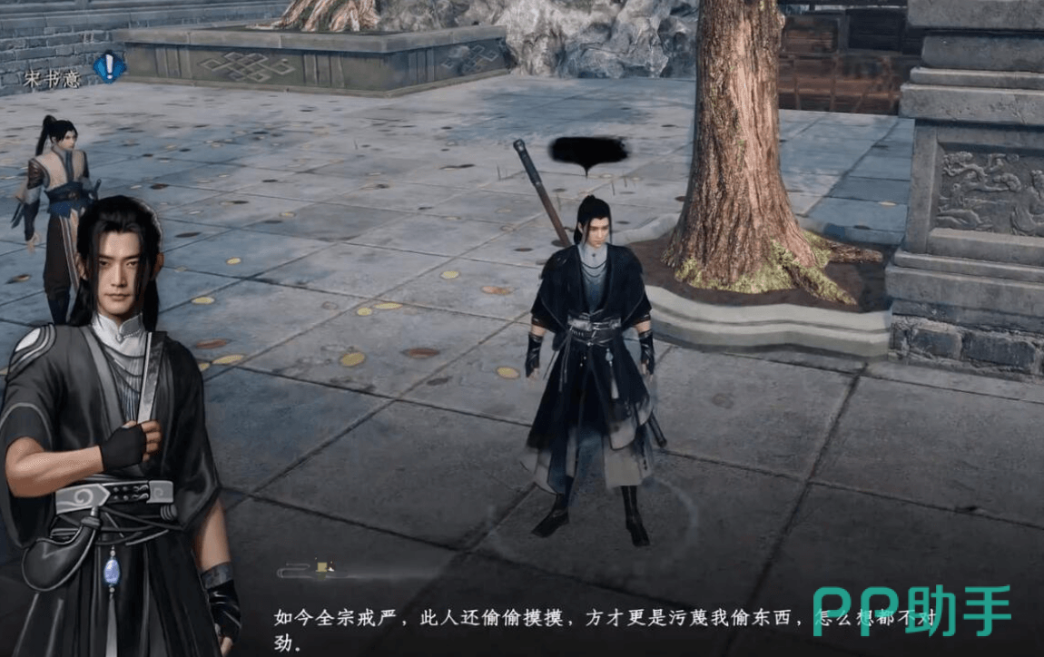此时我们可以四处与人交谈收集情报,问问宗门发生了什么样的异变,在对话的时候会触发剧情,刚刚陷害我们的人偷偷溜出了宗门,这里选择跟上,一出宗门在移除密林里面,就看到他在跟别人密谋,原来栽赃陷害主角都是他计划中的一环,这里需要战斗。