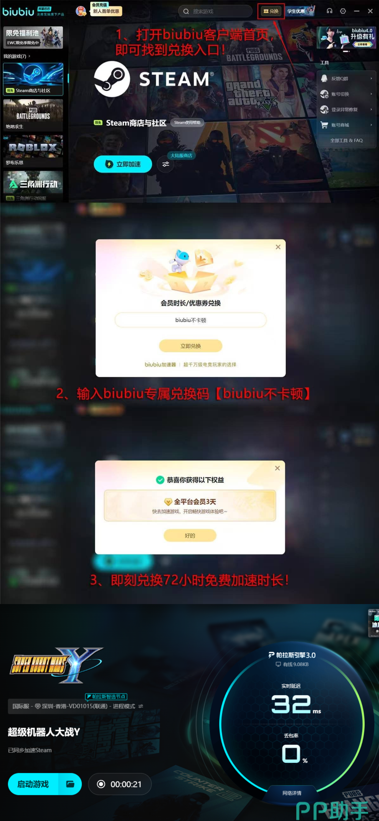 新人登录注册,立刻可以得到24小时免费体验机会,同时平台每个用户还可额外兑换三天体验时长,只需要使用【biubiu不卡顿】即可轻松获取。