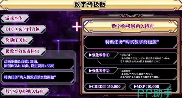 终极版包含豪华版以及标准版的所有内容,拥有DLC的抢先使用权,能够提前两天进行体验,此外还有极致音效的语音包以及数字原声集,还有一些独家机甲皮肤。