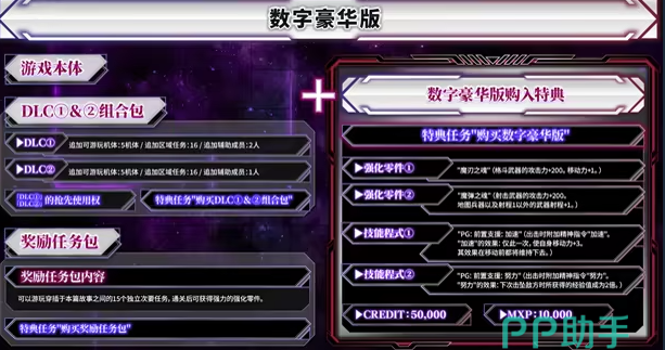 首先是普通标准版本,玩家可以得到塞巴斯塔,梵格尼克斯以及古朗凡格和特典任务以及新手礼包。其次是豪华版,在标准版的基础上追加了DLC1和2的组合包,增加了10台机体以及32个区间任务和三名辅助成员。