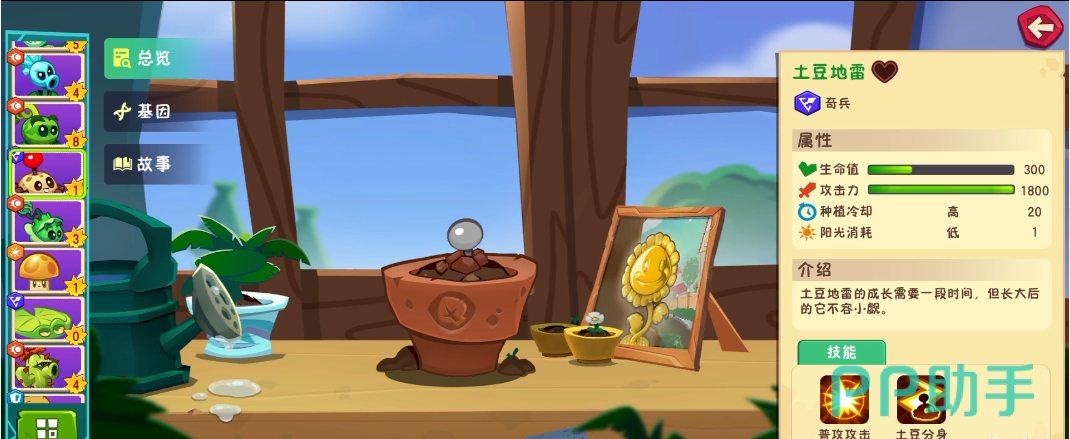 攻击力达到了1800的奇兵。将它种下去之后,需要等待一段时间成长,成型后才会出现在地面,与僵尸接触后会立刻自爆,对1格内全部敌方造成50%伤害。拥有技能“土豆分身”,它的技能使用后会随机在场上生成2个土豆地雷。虽然是一次性的,但是杀伤力十足。