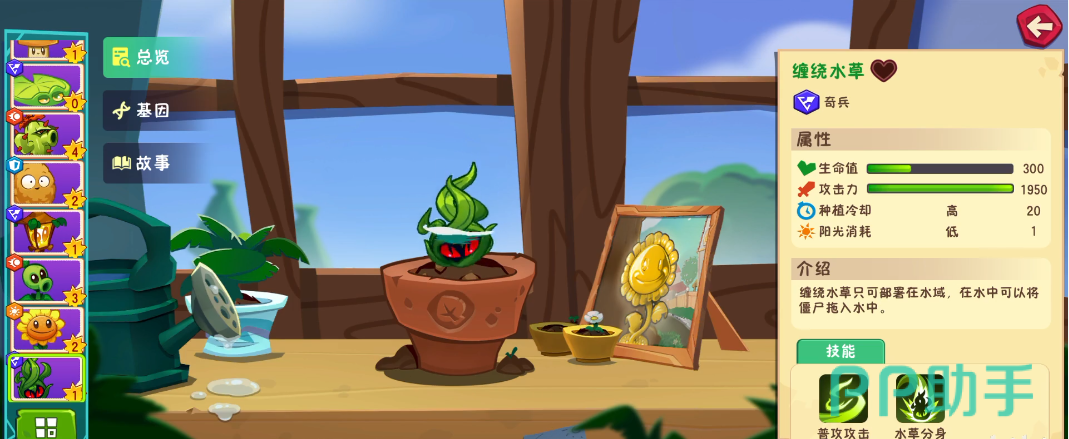 它也不会主动攻击僵尸,一般在水下使用,可以将接触到的第一个僵尸拖入水中然后一起消失,如果不能拖下水,则会对其造成50%伤害。“水草分身”能在自己上下两格各生成1个水草。