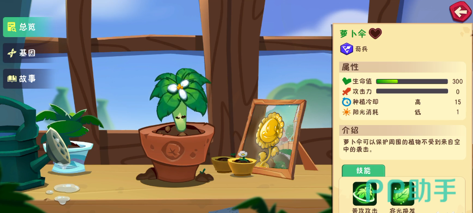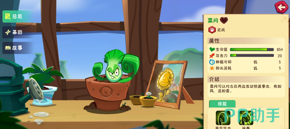 这是一颗近战植物,生命值854,20的基础攻击。普通攻击时,向左右2格内最近的1个敌人挥拳攻击,对其造成自身攻击力100%的伤害。技能“永春”,可同时对自身3X3范围内所有敌方单位攻击7次,每次造成自身攻击力800%的伤害。是个近战能力很强,输出较高的群攻植物。