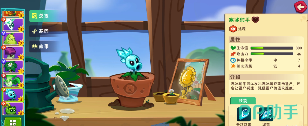 生命值和攻击力都相对还算均衡,是远距离输出植物。普攻向右侧一行发射寒冰豌豆,对距离最近的1个单位造成自身攻击力100%伤害,还会附带5秒的减速效果。小技能“冰锥”,它的下次攻击变为发射一发冰锥,对命中的1X1范围内的敌人造成自身攻击力118%伤害,并对僵尸造成冰冻效果。攻击力充足,同时能给僵尸进行控制,延缓它们的进攻速度。
