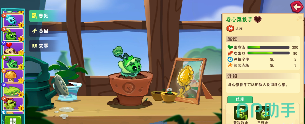 它能投掷剧毒的花朵攻击僵尸,让僵尸受到持续叠加的中毒效果。普攻就是通过花朵攻击僵尸,攻击附带毒碱,一旦击中会受到持续伤害,最高4层,每层附加25的伤害。小技能可以通过投掷毒瓶对3个目标进行攻击,敌人不仅受到100%伤害,还会被叠加一层“毒碱”。
