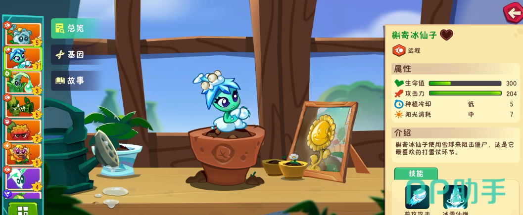 攻击力很强的远程植物。其普攻对场上距离自己最近的目标投掷雪球来进行范围性的伤害,一旦目标被攻击后遭受100%伤害。小技能开启后会对全场范围内射出4枚寒冰仙弹,每个寒冰仙弹都对对应范围内僵尸造成140%伤害。利用自身雪球阻止僵尸的进攻。