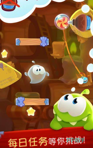 大家需要精准计算绳索切割时机,通过物理引擎模拟糖果下落的轨迹。游戏采用了创新的合成机制,玩家可将多个糖果组合升级以获取更高分数。主角卡通造型的绿色生物设计充满童趣,配合明亮清新的场景美术风格,游戏既考验玩家的逻辑思维能力又带来轻松愉悦的视觉体验。每个关卡都需要仔细分析绳索结构与障碍物分布,通过精确操作将糖果成功送达目的地。