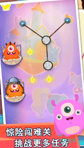 玩家需要通过精准计算和巧妙操作,帮助两只萌萌的小怪兽获取悬挂在半空的美味糖果。游戏设计了60多个精心打造的关卡,每个场景都呈现独特的视觉风格和机关设计,从古老城堡到未来实验室等6大主题场景带来截然不同的游戏体验。随着关卡推进,玩家将面临越来越复杂的物理谜题,需要灵活运用重力、弹力等物理原理,同时合理使用游戏提供的各种道具来破解难题,为小怪兽们开辟一条甜蜜的糖果之路。