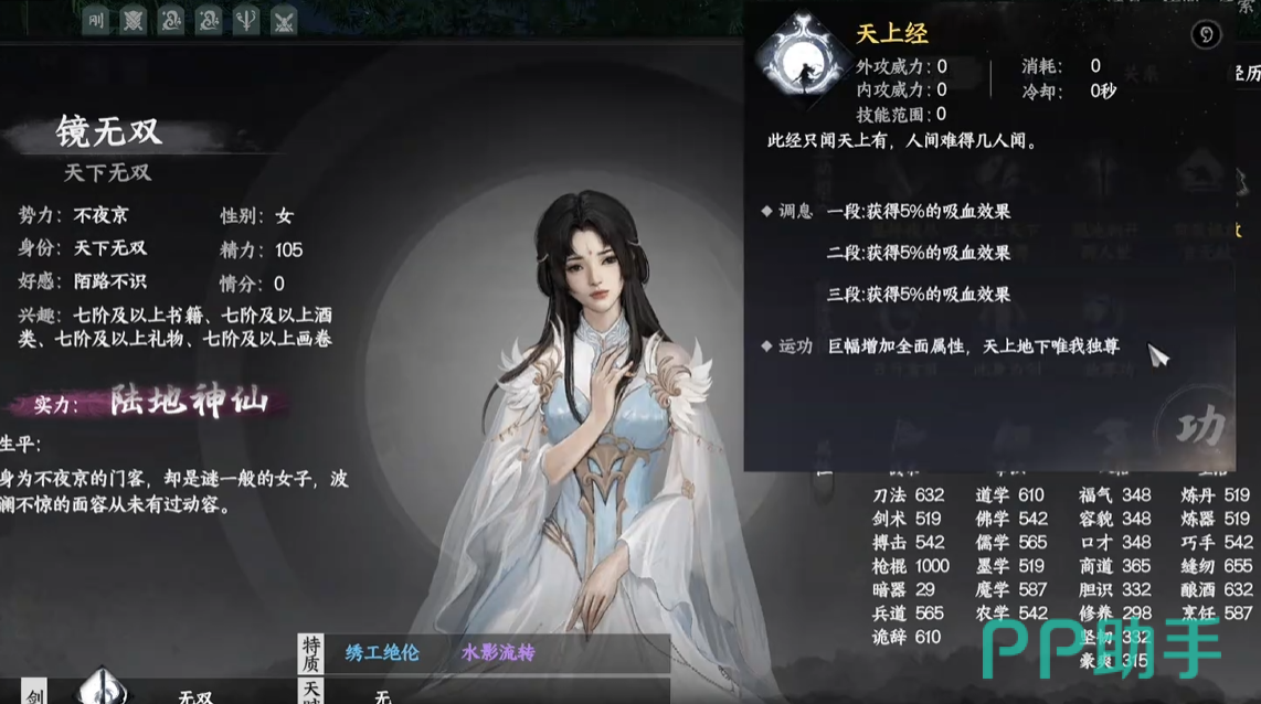 目前游戏中获得天上经的方式只有一个,那就是击败当前的战斗力,天花板镜无双,然后他就会把天上经赠送给你,不过想要击败他也需要完成一些前提条件,首先就是小伙伴们的。道学儒学和佛学这三项属性都需要拉到1000级,也就是当前的满级。其次就是要收集游戏内的另外三本金色书,分别为玄门法、菩提经和书院卷。这三本书都需要在完成指定的任务之后才可以获取。首先是菩提经,要求玩家们前往云鹤村完成一个叫做云鹤疑云的奇遇任务,才能够获取,这个任务的难度并不高。