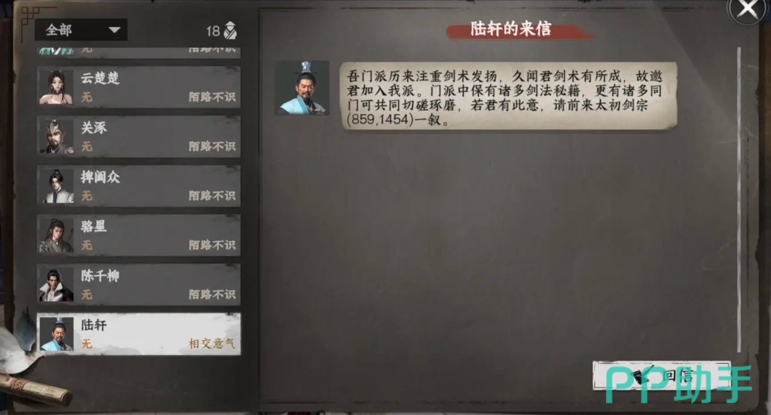 想要加入太初剑宗,玩家需满足剑术属性不少于50的硬性要求,若是属性不足50,各位可去找书画商买书来学习,很快就能涨到50。当各位的剑术属性满足要求时,就能收到陆轩的来信,他会诚邀玩家前往太初剑宗。若各位找不到太初剑宗的位置,可打开地图输入他给出的坐标(859,1454),就能直接定位到太初剑宗了。接下来,大伙只需要通过驿站快速移动至附近,并在坐标位置找到陆轩,与他对话选入门拜师,就能成为太初剑宗的一员。此时,各位玩家的身份为见习弟子,需满足晋升条件和完成晋升任务后才能晋升。