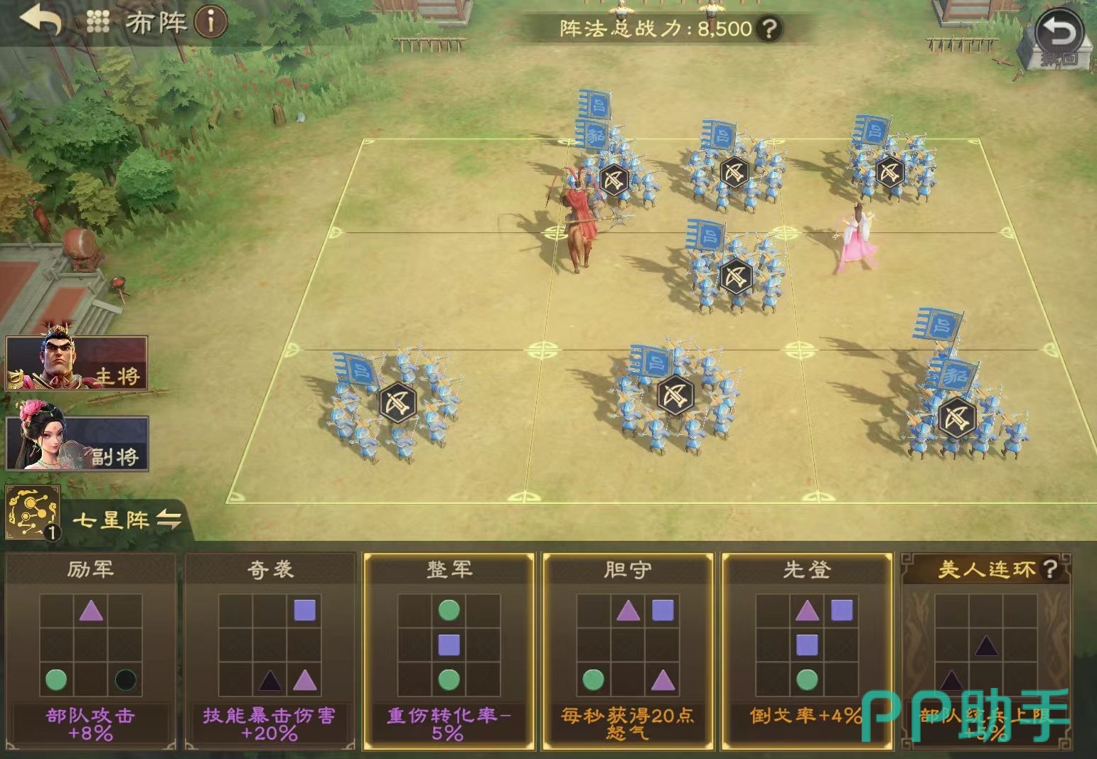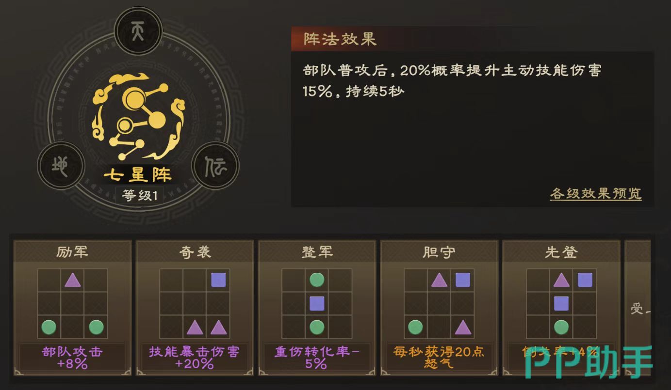 在游戏中通过提升军阶可以获得部分阵法,也可以通过活动获取,在招募过程中也可以得到阵法,七星阵就是属于阵法之一。七星阵的效果是在开启之后,部队进行普攻时有20%的几率,提升主动技能15%的伤害,持续5秒钟。七星阵是属于珍品阵法之一,在普攻时通过伤害提供额外的乘区,暴击上限高,技能增伤更稳定。七星阵主要用于技能体系,如果大家想要走主动技能伤害类型,那么选择七星阵是最佳的搭配。