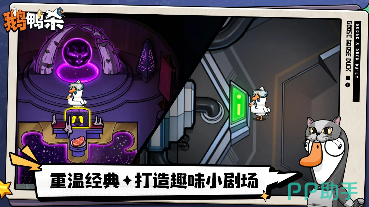 在这款游戏中,大家会被随机分配到鹅、鸭子或中立阵营,其中鹅作为好人方,需要完成任务并投票淘汰鸭子以获得胜利,鸭子则扮演的是反派角色,通过破坏活动、暗杀等手段阻止任务推进,中立角色拥有独特胜利条件,需被投票出局才能赢。