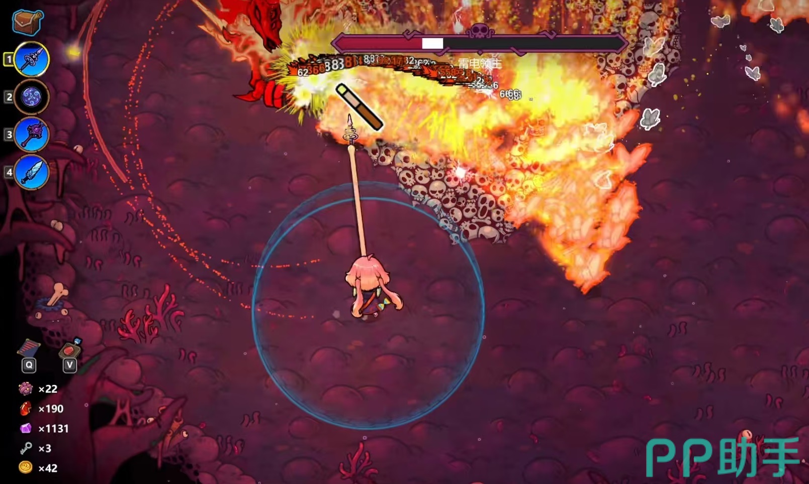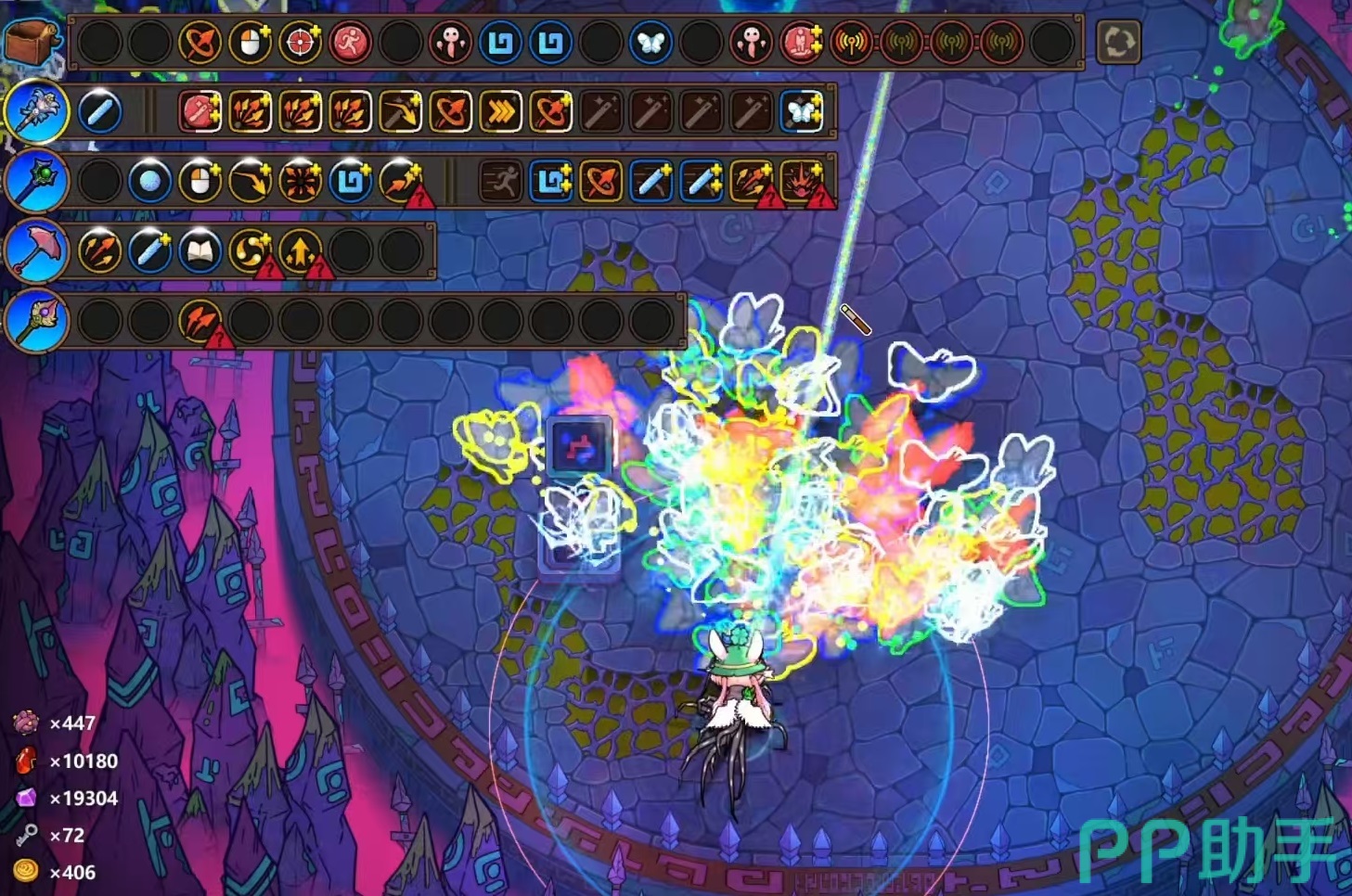 蝴蝶法术属于远程自动追踪型技能,蓝耗较低且具备散射特性,能够在中远距离持续压制敌人。但其存在射速较慢、飞行速度偏低的短板。为了弥补这些不足并提升输出效率,推荐搭配分裂与雷霆核心两个关键技能。分裂可使蝴蝶命中后分裂出更多子单位,扩大攻击覆盖面;而雷霆核心则赋予蝴蝶爆炸效果,在技能结束时触发范围伤害,两者结合可实现多段连锁爆炸,形成持续的区域压制。