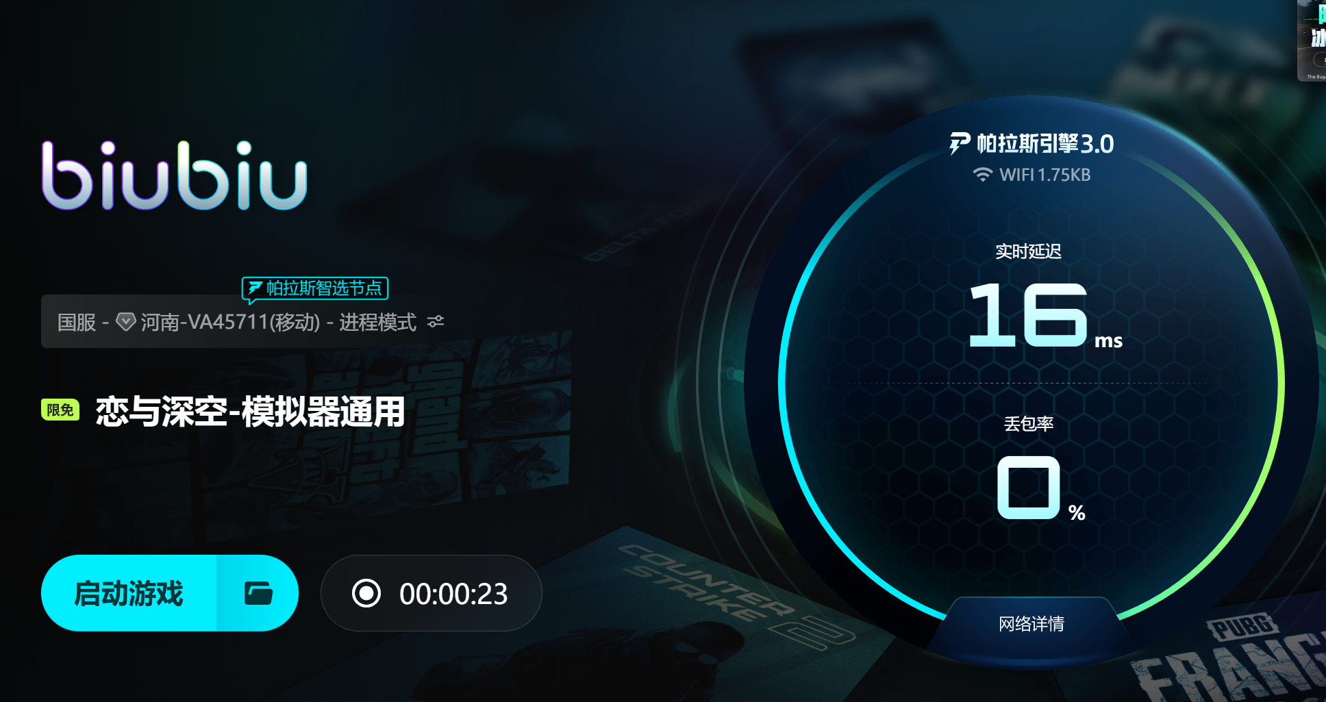 除了提供 generous 的免费时长外,biubiu加速器在技术架构上也具备明显优势。其携手冠军选手Aixleft,共同研发并集成了帕拉斯引擎3.0系统。该引擎通过智能路由优化机制,重构数据传输路径,显著降低网络延迟,并有效控制丢包率。即使在网络高峰期或跨区域连接场景下,也能维持较为平稳的数据交互状态。对于《恋与深空》这种对实时性要求较高的游戏而言,帕拉斯引擎3.0所提供的底层支持,极大提升了登录成功率与运行稳定性,帮助玩家远离因网络中断而导致的游戏中断困扰。