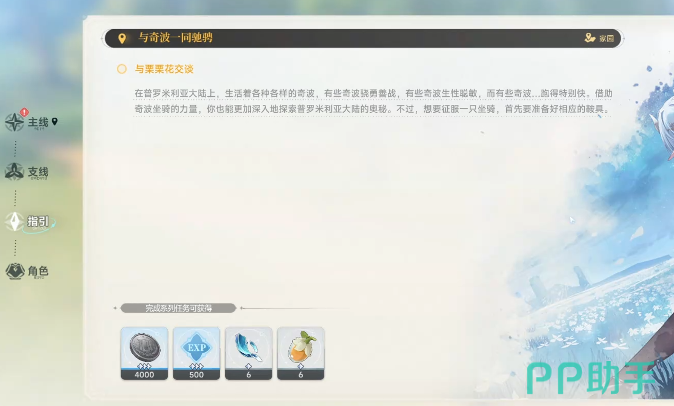 指引任务里有一个“与奇波一同驰骋”的任务,这个任务并不是主线。与家园的粟粟花对话,完成收集、采集、制作、捕获系列任务,都做完之后会跳出指引任务,完成这个任务后就可以制作鞍具了。
