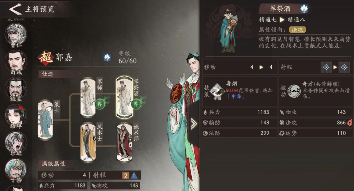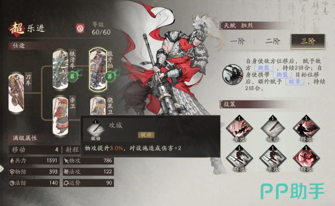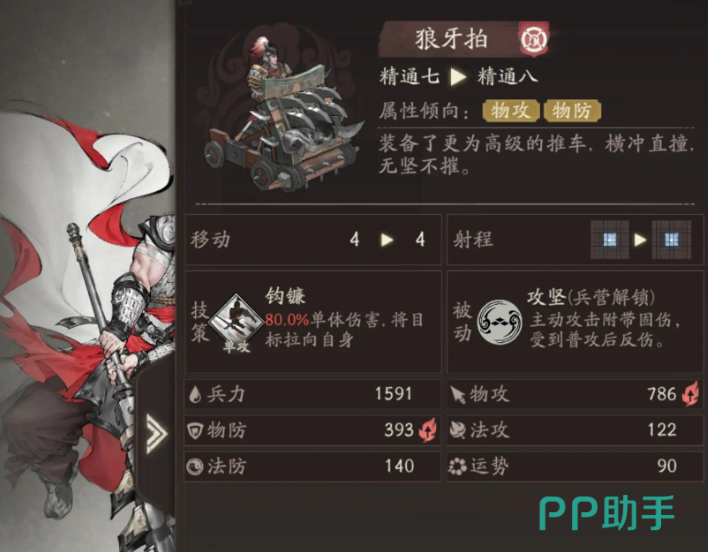 考虑到乐进的基础输出能力相对有限,建议优先选择狼牙拍作为其兵种配置。该兵种具备出色的物理防御属性,可显著提升前排承伤能力。若面对以法术输出为主的敌方阵容,则可灵活更换为骁果卫,以增强抗法能力,确保生存。