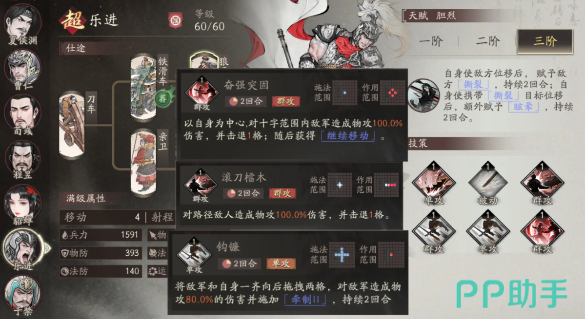 在技能搭配方面,应围绕“击退”与“控制”两大核心机制进行构建。推荐配置钩镰、滚刀檑木与奋强突围三个技能。钩镰可在攻击时将目标及其自身向后拉拽两格,造成伤害的同时附加牵制效果;奋强突围则能对范围内的敌军造成伤害并击退一格,释放后还能获得额外移动机会,提升战场机动性。