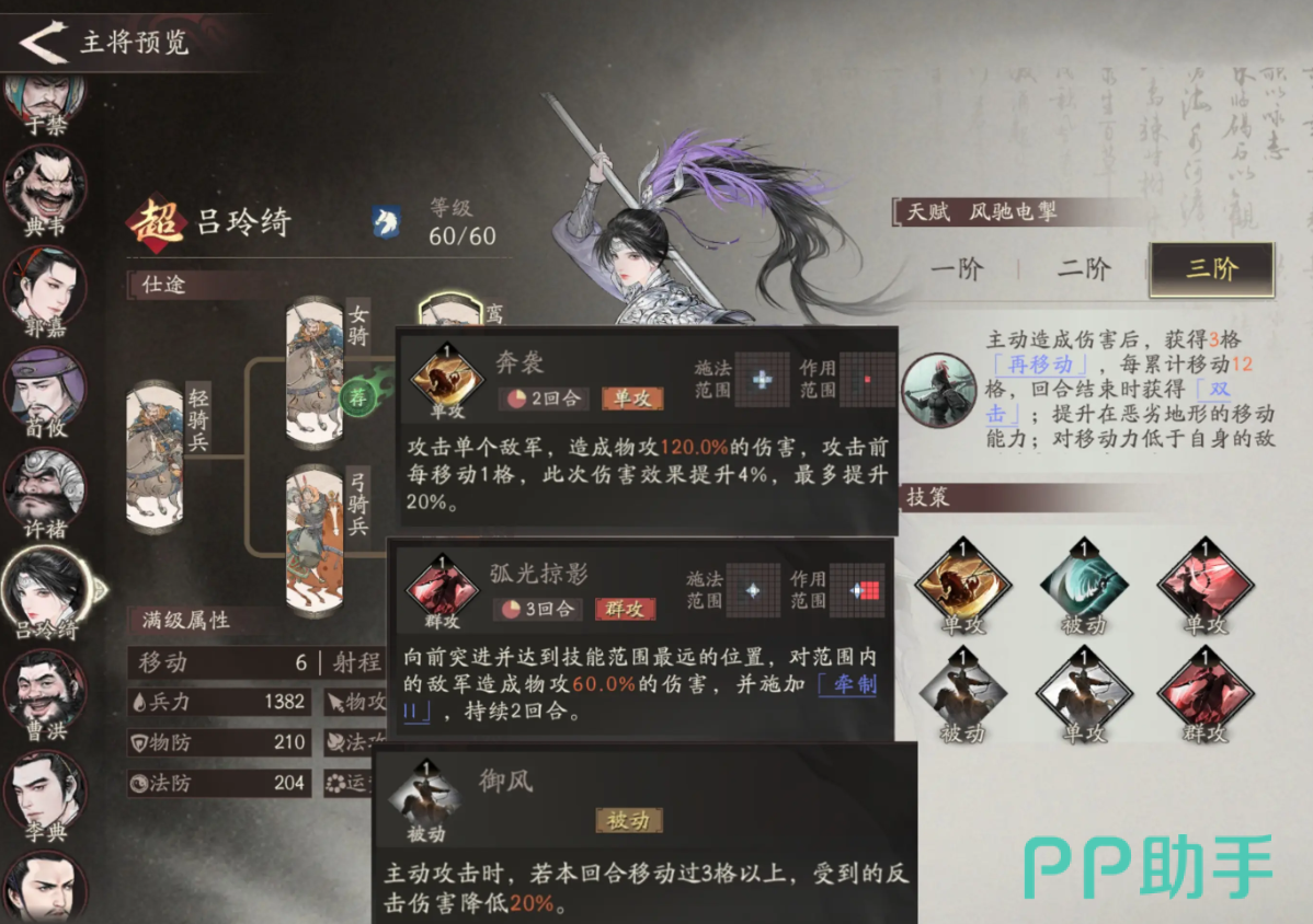 她的二阶天赋增强了在复杂地形下的机动性,三阶天赋则在面对移动力低于自身的敌人时,额外提升15%的伤害。由此可见,吕玲绮的整体强度高度依赖于高机动性的构建,通过频繁走位实现战场穿插与战术牵制,能有效配合队友完成集火或包围。但需注意其生存能力较弱,建议采取“打完即退”的策略,避免陷入被围剿的局面。