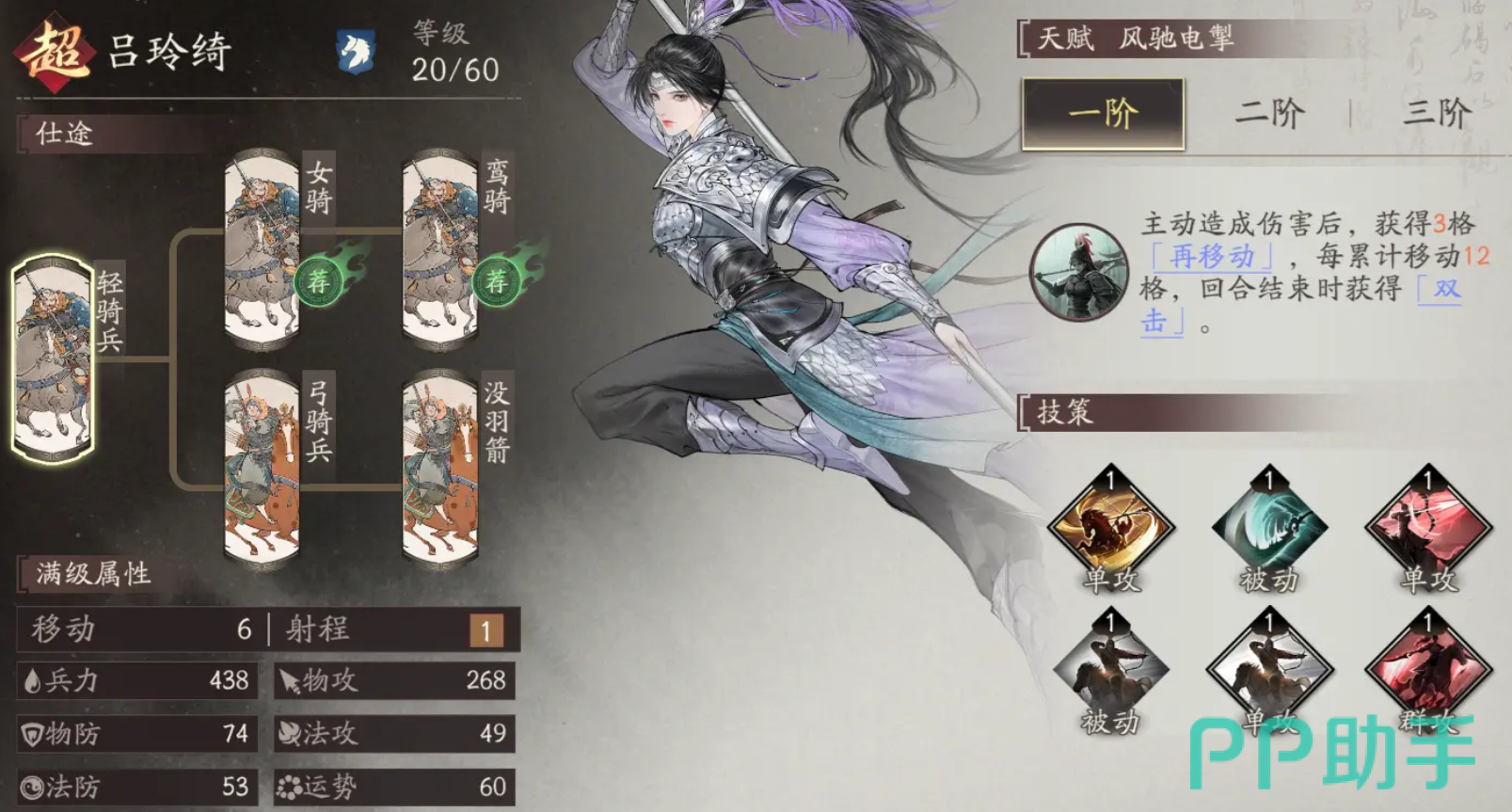 在职业选择上,吕玲绮拥有弓兵与骑兵两种路径,推荐优先选择骑兵路线。尽管骑兵形态下攻击范围仅为1格,但相比弓兵多出1点移动力,且基础物攻高出60点,更契合其依赖移动触发机制的战斗风格,能最大化发挥天赋优势。