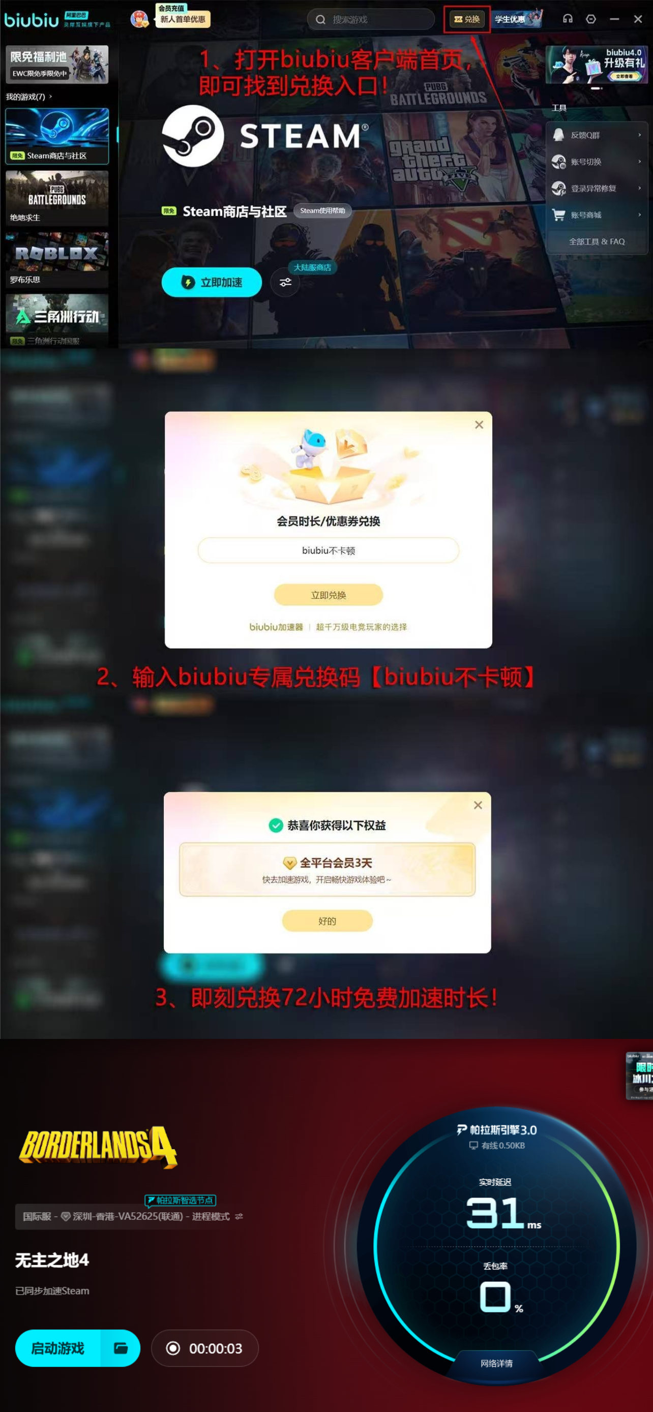 为了提升下载效率,推荐在游戏上线前安装上方提到的提速工具,它能够有效加快Steam客户端的访问速度,缩短游戏文件的下载时间。不仅如此,该工具在游戏运行阶段也能持续提供网络优化服务,确保联机体验更加稳定流畅。新用户注册后即可获得24小时免费加速时长,无需支付任何费用。此外,平台还额外赠送三天体验权限,只需在指定位置填写【biubiu不卡顿】即可领取。