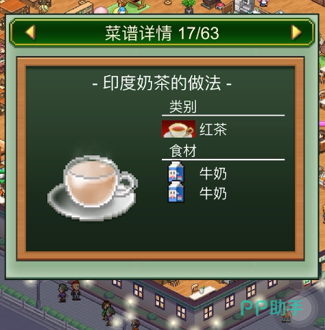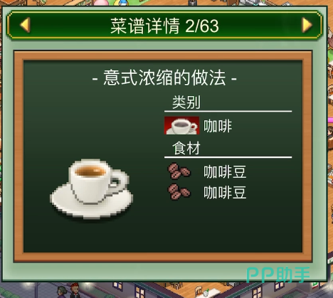 游戏中的食谱种类繁多,获取方式也各不相同,部分可通过完成任务直接解锁,另一些则需玩家自行研发。首先介绍的是咖啡系列。意式浓缩的制作材料为咖啡豆+咖啡豆;拿铁咖啡需要咖啡豆与牛奶组合;摩卡咖啡则需使用咖啡豆+咖啡豆装饰物,并加入巧克力酱方可完成。