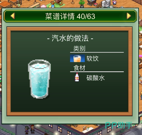 最后是软饮类别。初始可获得基础饮用水。冰抹茶拿铁需要抹茶+牛奶;果汁由苹果+柠檬制成;普通汽水仅需碳酸水即可完成;其他风味汽水则可通过添加对应原料与碳酸水组合,例如苹果汽水即为苹果+碳酸水。