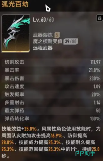 这里可以选择的武器很多,并且这些武器还被分成了近战武器和远程武器,这会更方便玩家在游戏过程中进行选择,如果想要进行远程攻击,那最好是选择枪械,弓箭的攻击距离会比常规的刀剑更远一些,算是中距离攻击武器,新手玩家初期可以使用弓箭攻击对手,这样可以避免和对手保持较近的距离,假如想要选择弓箭,比较推荐的有两种,首先就是弧光百劫,这是一个在外观设定上非常漂亮的弓箭,除了原有的弓箭外观之外,还会融入一些魔法的元素,使用这个弓箭进行攻击的话,除了常规的攻击作用之外,还能提升角色的效益,假如玩家选择的是风属性的角色,那还会额外提升13%的防御能力。