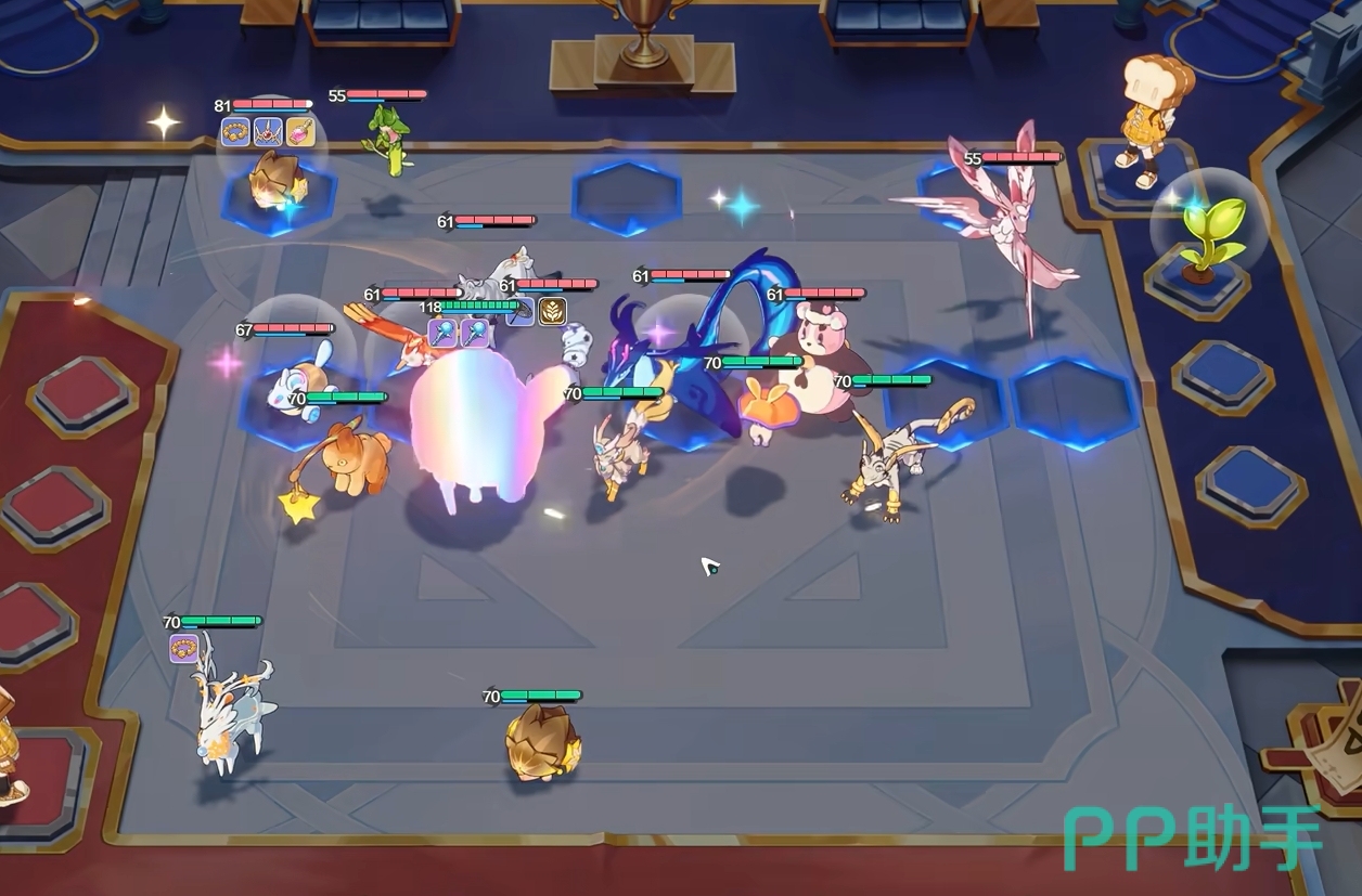 自走棋系统构成了游戏的主要战斗框架,具备较强的策略对抗性。玩家需将精灵部署在棋盘上,通过组合不同单位激活羁绊效果,并灵活调整站位,使其在战斗中精准打击目标,提升胜率。装备系统支持自由装配,获得的装备可随时装备或卸下,不绑定特定精灵,便于战术灵活调整。每局胜负判定机制清晰:击败对手全部精灵即可赢得小局,最终击溃对方主力则获得整场对局胜利。
