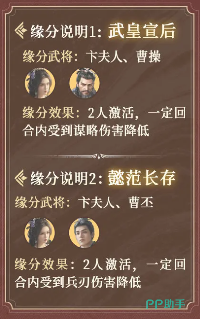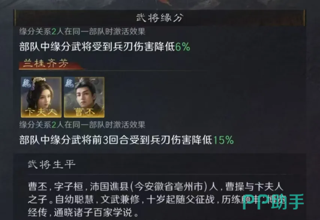 卞夫人还拥有两项武将缘分:其一与曹操共同上阵时,可显著降低全队所受的谋略伤害;其二与曹丕搭配,则在状态触发时进一步减少两人受到的兵刃伤害,进一步提升生存能力。