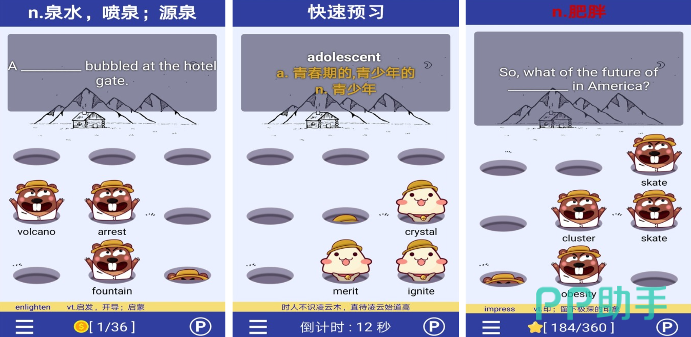 以打击地鼠为核心玩法,每个冒出的地鼠头顶显示一个待学单词,玩家需快速识别并点击对应词汇。结合视觉联想技术,增强记忆留存率。每天仅需投入20分钟即可完成大量词汇复习。生动的角色动画与流畅界面设计显著提升学习兴趣,帮助用户在轻松氛围中掌握单词用法与含义。