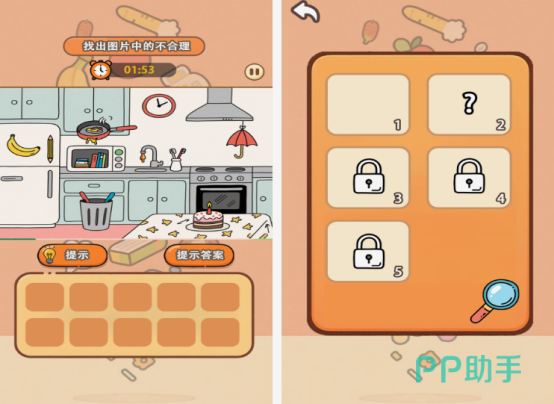 这是一款结合观察力与思维能力的找不同游戏。与传统找茬不同,本作加入了文字提示和情境推理元素,玩家需结合画面与描述信息,仔细分析才能发现隐藏的差异点。挑战内容涵盖日常生活用品、食物等常见元素,既贴近现实又富有创意。通过层层关卡,不仅能提升专注力,还能增强逻辑判断能力,是锻炼孩子综合能力的优质选择。