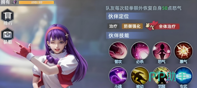 作为队伍中不可或缺的治疗型角色,麻宫雅典娜极大地增强了团队的生存能力。每当己方角色使用轻拳时,她都会额外获得50点怒气,加快技能释放节奏。当任意队友生命值首次低于30%时,她将自动触发爆气,立即为全体友方恢复15%最大生命值,并使该效果持续两回合。