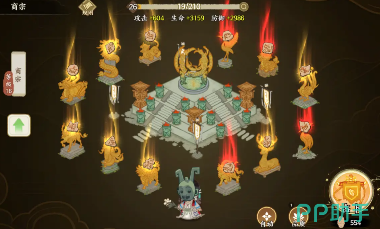 龟甲可通过海域采集点获取,最多派遣三支队伍同时作业。积累一定数量后,使用占卜功能可转化为兆纹。兆纹为全体名士提供属性加成,并可强化神兽技能。其等级与品质越高,增益效果越强。提升占卜等级是获取高等级兆纹的关键,该等级通过分解多余兆纹积累经验成长,而兆纹品质则受商宗等级影响。