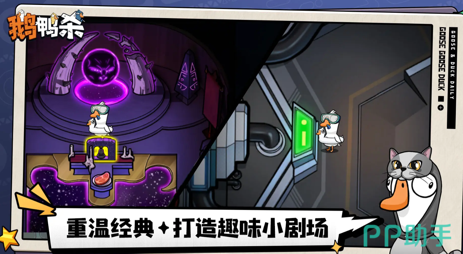 胜利条件因身份而异。鹅的目标是完成所有任务点或通过投票将鸭和中立角色全部淘汰;鸭则需在不被投票出局的前提下,利用冷却时间为17秒的击杀技能逐步消灭足够数量的鹅以取得胜利;中立角色拥有独特的获胜方式,例如呆呆鸟需要成功被其他玩家投票驱逐才能达成胜利条件,这类设计有效平衡了整体对抗局势。
