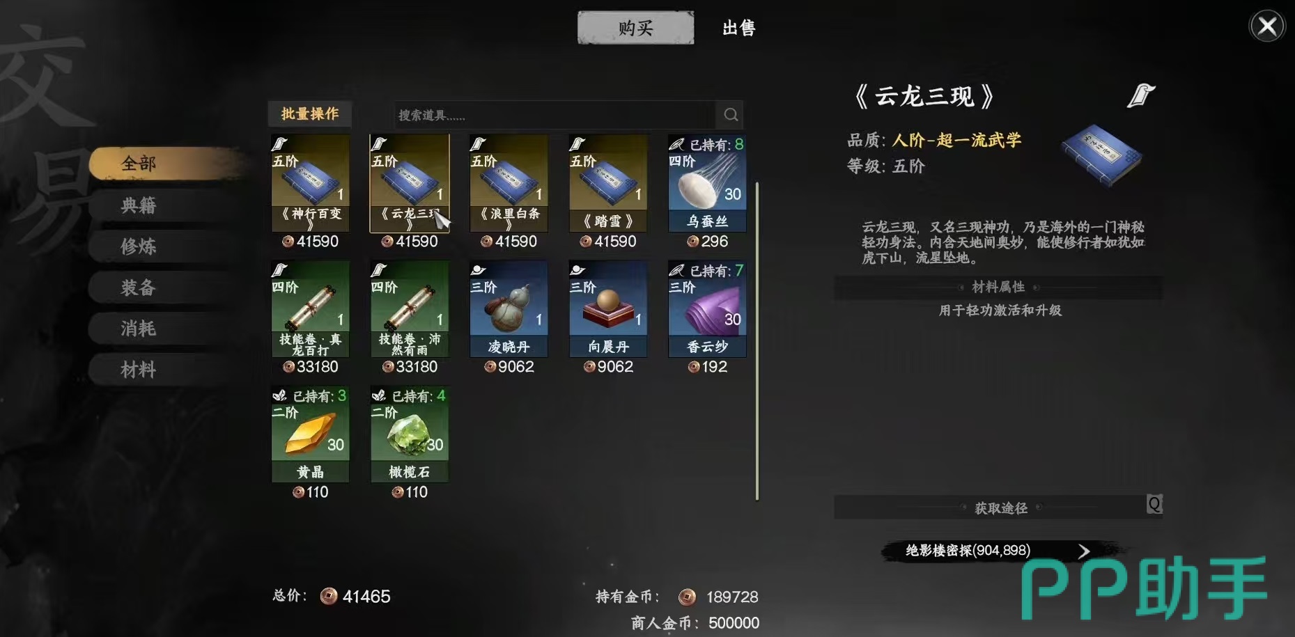 获取方式并非通过隐藏任务或随机掉落,而是直接购买。玩家需前往枰栌地图,定位至坐标904.899处,找到名为“绝影楼密探”的NPC。与其对话并进入交易界面后,即可在商品列表中看到包括云龙三现在内的多本金色轻功秘籍,如神行百变、浪里白条、踏雪等。建议条件允许的情况下全部购入,以便在轻功系统上实现全面强化,达到毕业级别配置。