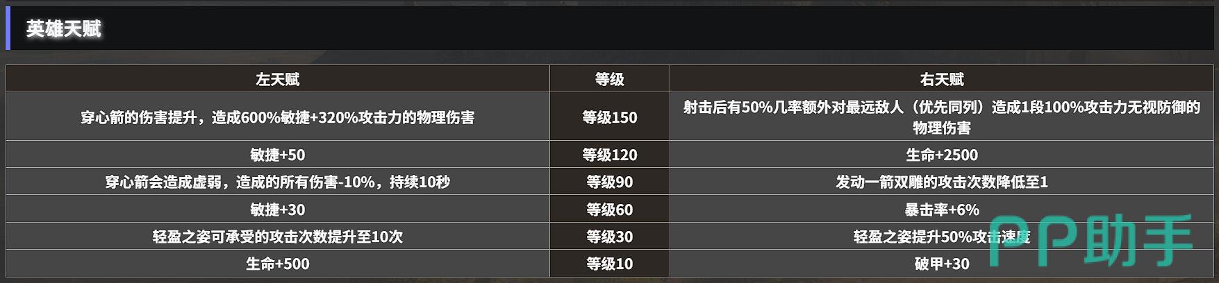 天赋系统分为生存强化与输出提升两个方向。10级时左路线增加生命值,右路线提升破甲效果;30级左分支可将“轻盈之姿”的受击上限由5次提升至10次,大幅增强持续作战能力,右分支额外提供50%攻击速度;60级左天赋增加30点敏捷,右天赋提高6%暴击率;90级左天赋使“穿心箭”附带震慑效果(降低目标10%所受伤害),右天赋优化“一箭双雕”的目标选择逻辑;120级左天赋增加50敏捷,右天赋增加2500生命值;150级左天赋进一步强化“穿心箭”伤害至500%敏捷加320%攻击力,右天赋赋予普攻后50%概率对最远敌人发动无视防御的追加攻击。推荐加点顺序:优先解锁30级左天赋延长被动持续时间,随后点出60级右天赋提升暴击率,接着补全90级右天赋优化技能联动,最终投入150级左天赋最大化主力技能伤害。