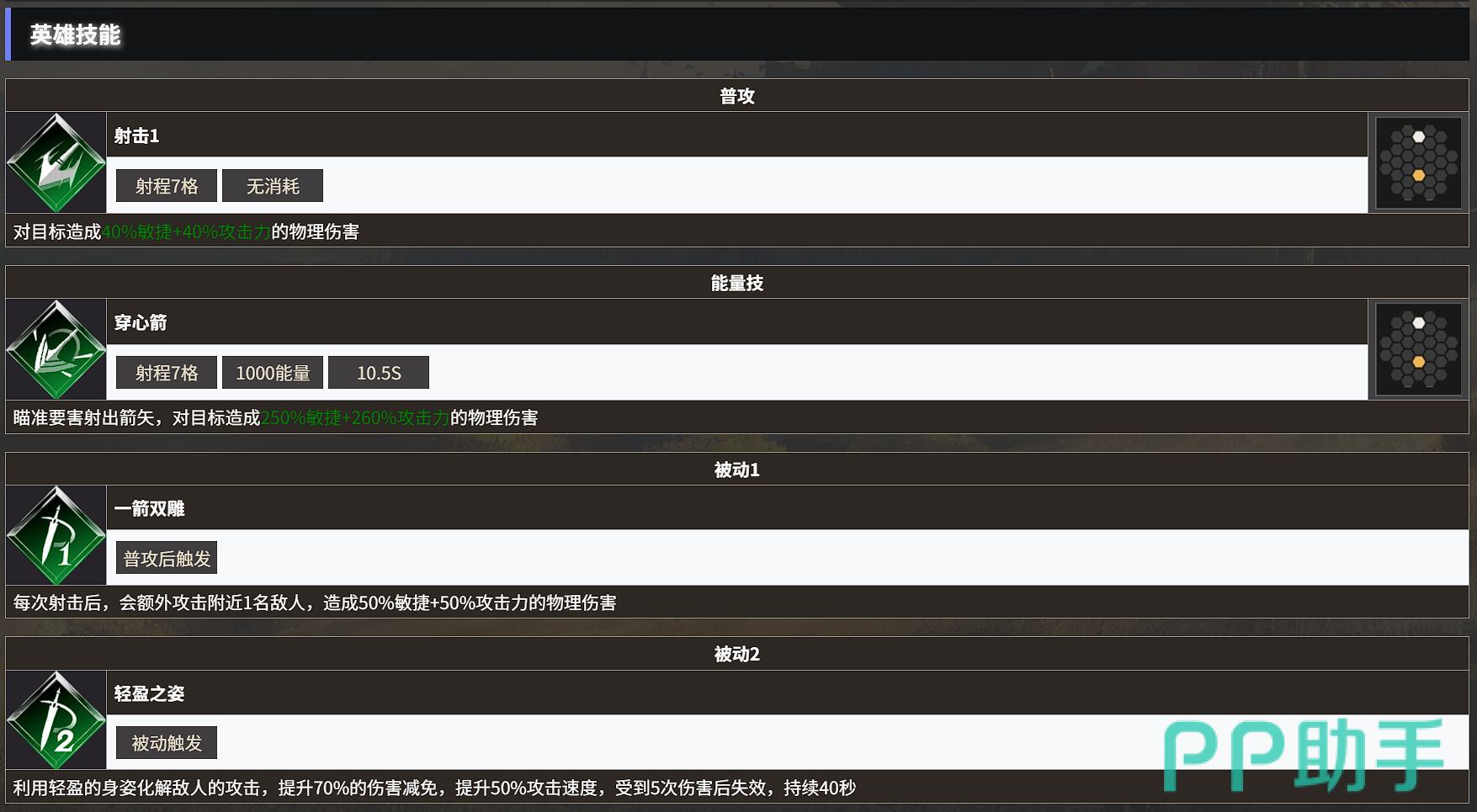 该英雄的输出体系高度依赖敏捷属性。普通攻击“射击1”拥有7格射程,造成400%敏捷加300%攻击力的物理伤害,无能量消耗,构成主要的基础输出手段。“穿心箭”作为关键能量技,需消耗1000点能量,冷却时间为10.5秒,可对直线路径上的首个目标造成500%敏捷加250%攻击力的伤害,并对第二个敌人附加50%递减伤害,在BOSS战中建议优先释放以确保命中主目标。被动技“一箭双雕”可在每次普攻后自动触发,额外锁定一名最远距离的敌方单位进行打击,造成50%敏捷加50%攻击力的伤害;而“轻盈之姿”则在被击中时立即激活,提供高额减伤与攻速增益,配合天赋可延长其有效触发次数,从而实现更持久的输出循环。