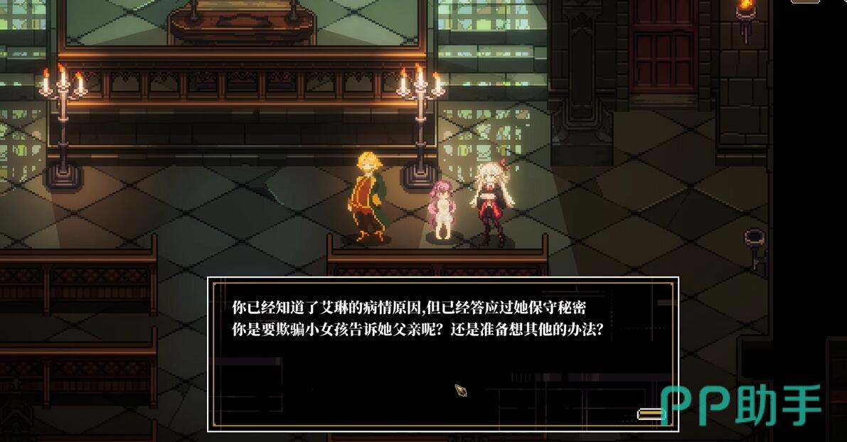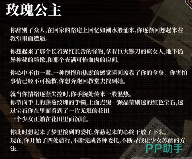 哚哚线(玫瑰公主结局)需在与富豪谢尔曼对话时选择掩护,罪律室被触手拉拽时放弃抵抗以获得服食灵药特质(战斗后自动回血)。被哚哚送出教堂后,贿赂右下居民获取火药,返回地下室神父处拿十字架,调查原珠子位置触发传送即可解锁结局。