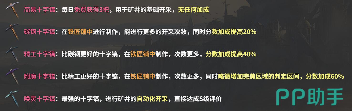 采矿过程中需使用对应等级的矿镐。系统每天免费提供3把简易矿镐,作为基础采矿工具适用于日常练习。碳钢矿镐可在铁匠铺制作,所需材料为20铁矿和5秘银,性能优于初级工具。而精灵矿镐则为稀有道具,仅能通过限时活动获取,使用后可享受100%积分加成效果。建议在挑战高难度区域时配备高级矿镐以提升收益。