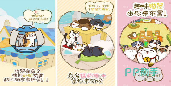 以猫咪挂机为主,有超过几百种各具特色的猫咪,等你前来收集,独创的特色玩法,将带着猫咪在无比温馨的豪宅当中自由畅玩。可以布置猫咪房间,也能够给这些可爱的小宠物拍一张美美的照片。甚至也能够与家居互动,要学会给猫咪铲屎帮忙洗澡,只有这样才能够让这些可爱的宠物健康成长。