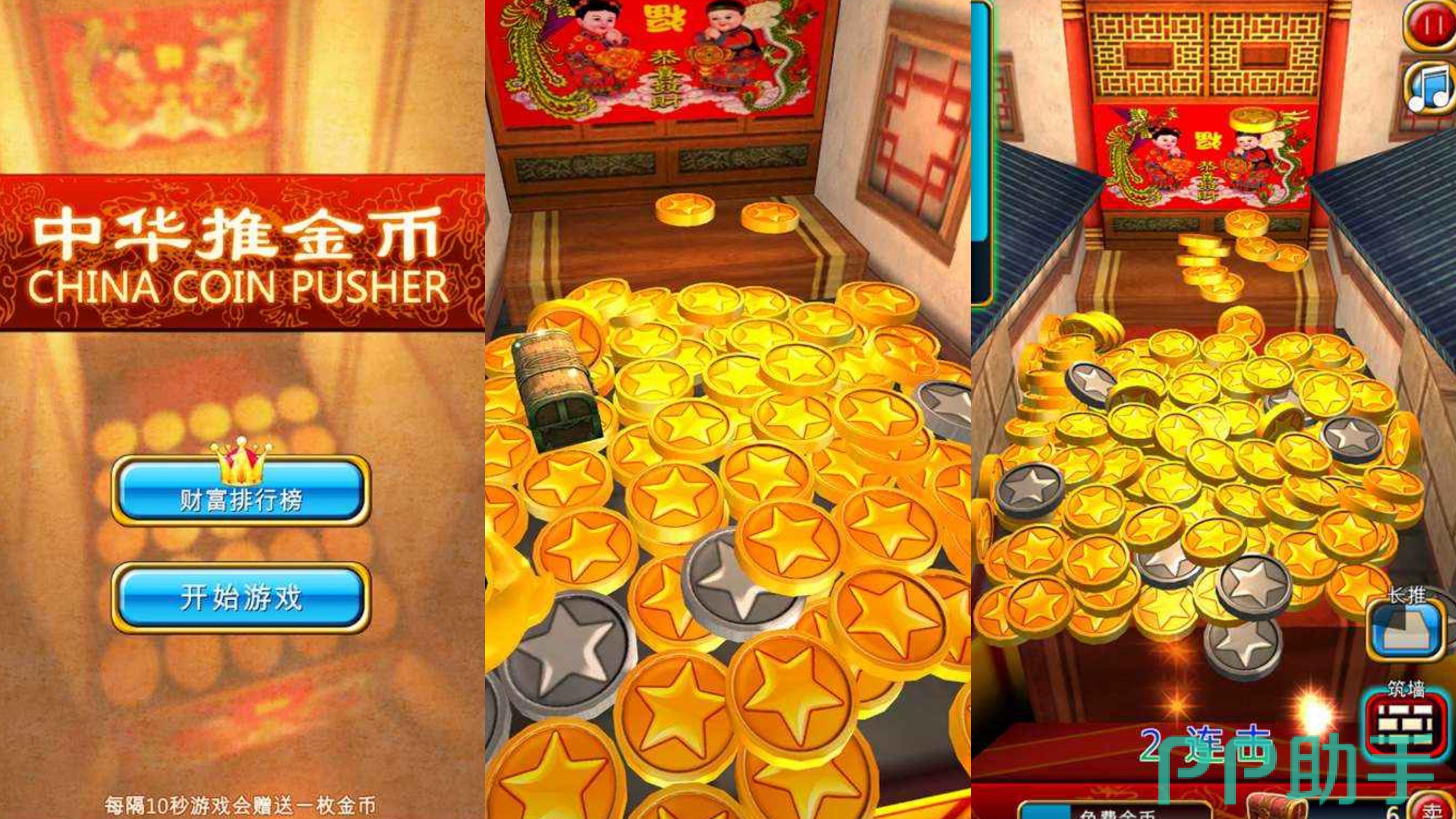 《中华推金币》是一款十分复古的中国风休闲益智类手游。游戏有着丰富的玩法内容,精美的游戏画面以及超酷的游戏特效,一定会给玩家一个最豪华的推金币游戏体验!而且游戏内的关卡和时间都没有设限,玩家可以尽情享受推金币的乐趣。游戏内每10秒就会赠送一枚金币给玩家,所以大家不用担心金币不够。此外,游戏还有金币排行榜,大家可以在排行榜中查看其他玩家的金币积累程度,然后累积更多的金币,成为金币排行榜上的no.1!