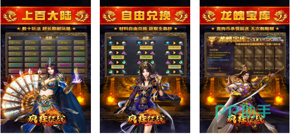 疯狂征战也是款复古怀旧风的三职业传奇主题冒险游戏,很特殊的挂机操控系统不用大家长时间操作,各种有趣的福利活动期待着大家随时参与,武器道具数量丰富带来的满足感别具一格,在商城中甚至可以以物换物获得更多的资源,龙魂宝库的系统上线更容易让玩家的实力得到提升,超大且开放的传奇地图面积也是点睛之笔。