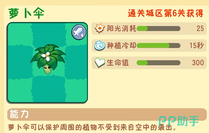 萝卜伞是一种专用于应对空中威胁的防御性植物。自身无攻击力,仅需25点阳光即可种植,冷却时间为15秒,生命值为300点。其特殊技能是可以为邻近植物提供免受空中单位攻击的保护罩。面对游戏中新增的飞行类僵尸时,该植物能极大提升阵容稳定性,尤其适用于空袭频繁的地图场景。