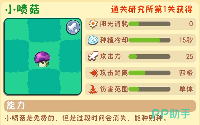 小喷菇以其零阳光消耗的特点成为应急利器。虽然会在一段时间后自动消失,但15秒的冷却时间使其可反复使用。基础攻击力为25点,虽不突出,但在资源紧张或开局阶段能够迅速填补火力空缺,发挥出色的过渡作用。