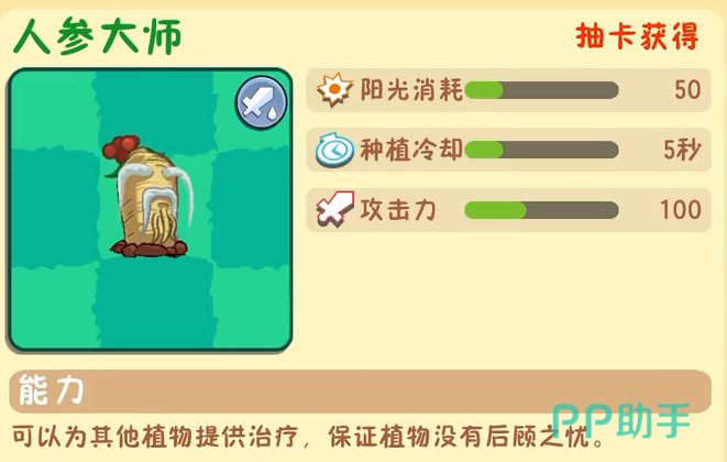 第二个介绍的是人参,属于本次新增的辅助类植物。尽管初始测试版本中无攻击能力,但在最新调整中已具备100点攻击力,同时保持50点阳光的种植成本和5秒冷却时间。其核心作用在于治疗周围植物,虽治疗范围有限,但合理布局下可有效延长前排植物存活时间,增强整体续航能力,在持久战中尤为关键。