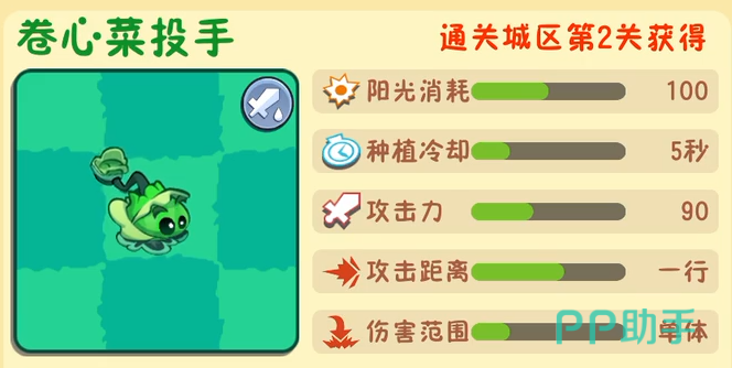 卷心菜投手作为回归角色,外观更加卡通化,攻击方式依旧为单行投掷。需要100点阳光进行部署,冷却仅5秒,适合频繁调动。虽然基础攻击力偏低,但胜在出手稳定,且进化后可附加火焰伤害,对群体敌人造成持续灼烧效果,是前期远程打击的重要选择之一。