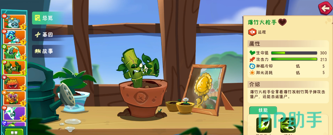拥有300点生命值,虽单次伤害不高,但攻击稳定性强。普通攻击以尖刺形式进行,技能“贯穿子弹”可向右侧一行发射一枚穿透两名僵尸的强化尖刺,伤害比基础攻击提升47%,适合布置在远程输出位,提供稳定的线性压制力。